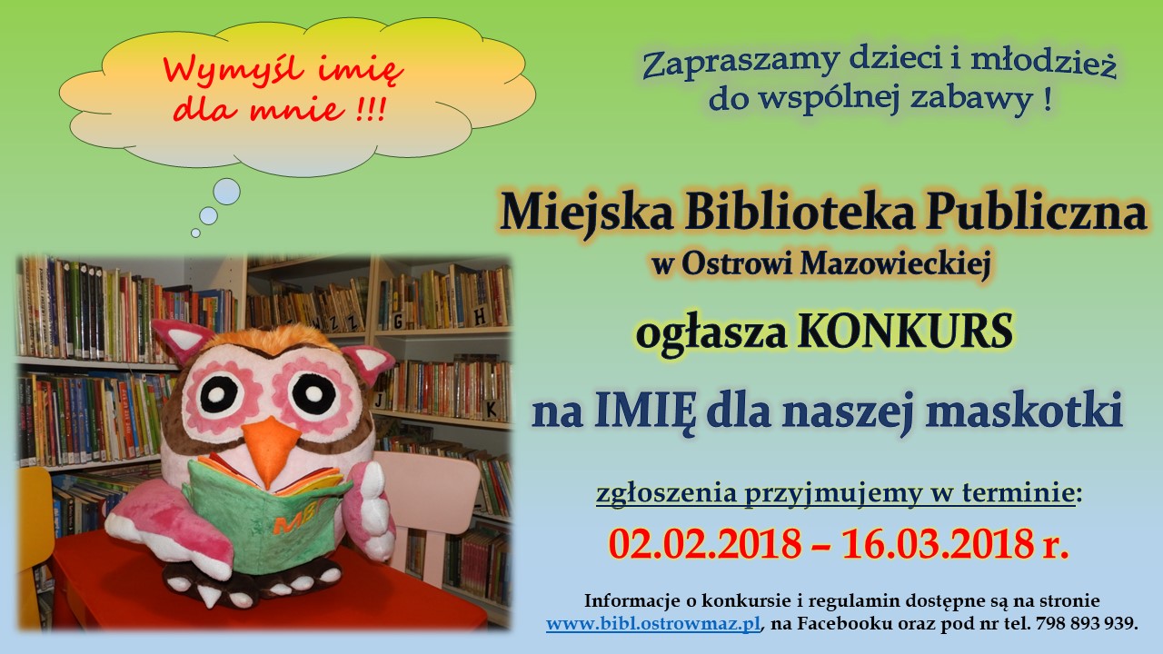 Z tej okazji MBP przygotowało dla mieszkańców szereg imprez, które uświetnią jubileusz. Pierwszą propozycję kieruje do dzieci i młodzieży. Jest nią konkurs na imię dla maskotki.