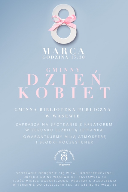 Spotkanie odbędzie się w sali konferencyjnej Urzędu Gminy Wąsewo. Ilość miejsc ograniczona - zgłoszenia do 6 marca br. tel. 29 645 80 00 wew. 38 lub osobiście do Marty Wójcik.