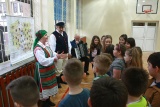 Bożena Jakubczyk - opiekun, założyciel i choreograf zespołu, opowiedziała dzieciom o polskich strojach ludowych, przybliżając wszystkim uczniom ich poszczególne elementy i znaczenie. Uczniowie mieli również okazję posłuchać melodii granych na akordeonie.