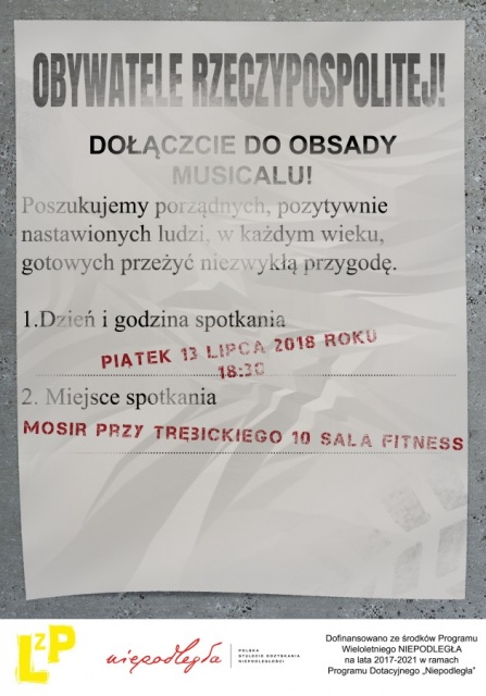 - Szukamy pozytywnie zakręconych osób, które chcą przeżyć niezwykłą przygodę i wystąpić w musicalu o tematyce niepodległościowej! Wystarczy przyjść 13 lipca w piątek do sali fitness w MOSIRZE (przy ul. Trębickiego) i przekonać nas o chęci wzięcia udziału w tym nowym projekcie - zachęca koordynatorka projektu Dominika Potomska. - Spotkanie przebiegnie w formule rozmowy z twórcami musicalu. Startujemy o godzinie 18:30 - dodaje.