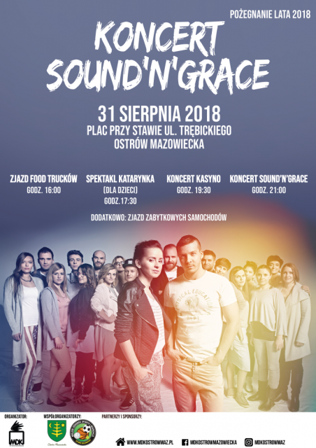 O 17:30 MDK zaprasza wszystkie dzieci na spektakl Katarynka, następnie o godz. 19:30 odbędzie się koncert Kasyno, a o 21:00 niesamowity koncert Sound'n'Grace! Dodatkową atrakcją będzie zjazd zabytkowych samochodów.