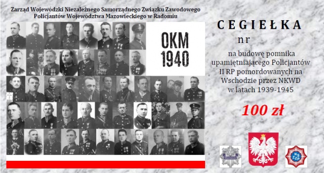 Komendant Wojewódzki Policji zs. w Radomiu - insp. Tomasz Michułka wspólnie z Przewodniczącym Zarządu Wojewódzkiego NSZZ Policjantów Województwa Mazowieckiego w Radomiu - podinsp. Dariuszem Brzezickim podjęli decyzję o uczczeniu policjantów II RP pomordowanych na Wschodzie przez NKWD w latach 1939 - 1945r. Wyrazem tego będzie posadowienie na terenie KWP zs. w Radomiu pomnika upamiętniającego ich tragiczne losy. Decyzja ta wpisuje się w uroczyste obchody 100. rocznicy powołania Policji Państwowej.