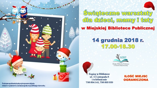 Świąteczne warsztaty odbędą się już 14 grudnia w godzinach 17:00-18:30. Zapisy prowadzone są w siedzibie MBP oraz telefonicznie pon numerami: 798 894 141, 798 893 939.