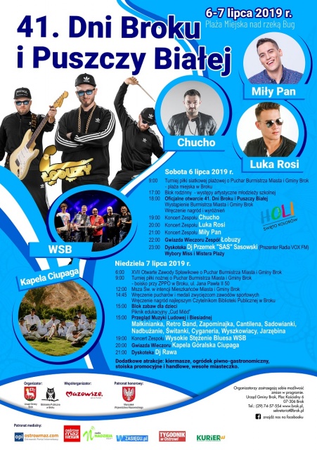Podczas tegorocznych 41. "Dni Broku i Puszczy Białej", które odbędą się w dniach 6 - 7 lipca na błoniach Plaży Miejskiej w Broku, przygotowano bogaty program a w nim m.in.: prezentację umiejętności i talentów młodzieży szkolnej, występy regionalnych zespołów muzyki ludowej i biesiadnej, blok rekreacyjny dla dzieci oraz liczne koncerty muzyczne trafiające w gusta wszystkich słuchaczy, wystąpią zespoły takie jak: Łobuzy, Miły Pan, Luka Rosi, Chucho, Wysokie Stężenie Bluesa oraz Kapela Góralska Ciupaga. W programie ponadto: dyskoteka z DJ, wesołe miasteczko, emocjonujące wydarzenia sportowe i wiele innych.