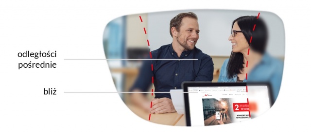 Dobrym rozwiązaniem w takich sytuacjach są tak zwane okulary do pomieszczeń, które charakteryzują się możliwością swobodnego widzenia z bliska i odległości pośredniej. Umożliwiają to soczewki okularowe, w których patrząc przez ich górną część szkła użytkownik będzie widział elementy na większą odległość, nawet do kilku metrów, takie jak pomieszczenie biura, kuchni czy monitor komputera. Natomiast w dolnej części soczewki znajduje się korekcja do bliży, która umożliwi patrzenie na przykład na dokumenty, klawiaturę czy przepisy. Dzięki takiemu rozwiązaniu użytkownik w pracy może przyjąć najbardziej swobodna pozycję ciała oraz cieszyć się dużym komfortem czytania bez konieczności męczenia wzroku