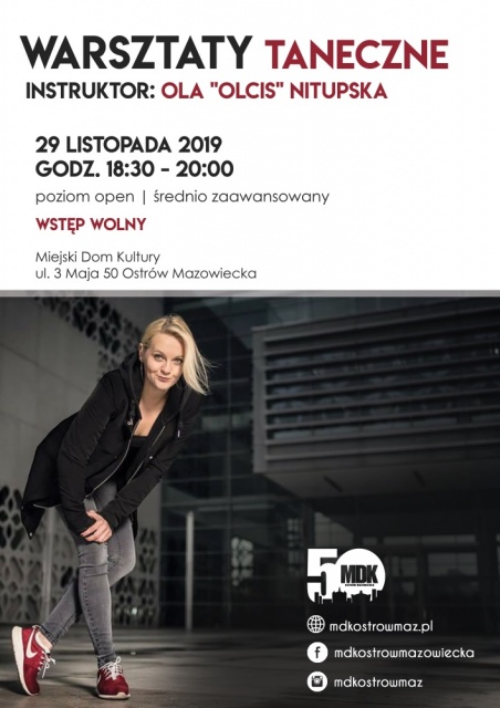 Warsztaty taneczne z Olą "Olcis" Nitupską odbędą się 29 listopada 2019 w godz. 18:30 - 20:00 w MDK przy ul. 3 Maja 50. Wstęp wolny.