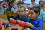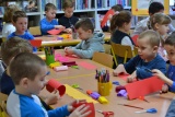 Mali uczestnicy warsztatów tworzyli za pomocą krepiny i bibuły oraz innych materiałów plastycznych piękne koszyczki wypełnione kwiatami oraz ozdobnymi drewnianymi serduszkami. Ponad godzinne spotkanie okazało się bardzo owocne, czego dowodem są wykonane przez małych artystów prace, które dzieci następnie mogły wręczyć dziadkom.