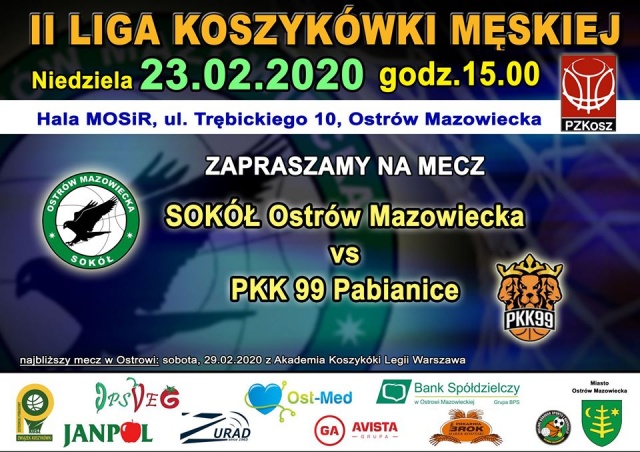 Mecz rozegrany zostanie na hali MOSiR-u przy ul. Trębickiego 10. Drużyna Sokoła zaprasza wszystkich miłośników koszykówki.