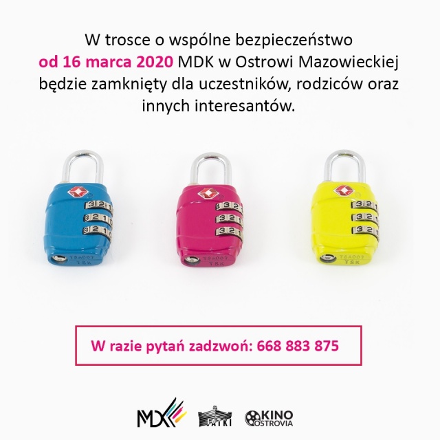 Kochani kursanci, rodzice uczestników zajęć, klienci kina i galerii, współpracownicy z miasta i innych jednostek oraz mieszkańcy Ostrowi Mazowieckiej w trosce o wspólne bezpieczeństwo - kasy biletowe MDK, sekretariat, biura obsługi - będą nieczynne do odwołania. W razie pytań prosimy o kontakt: