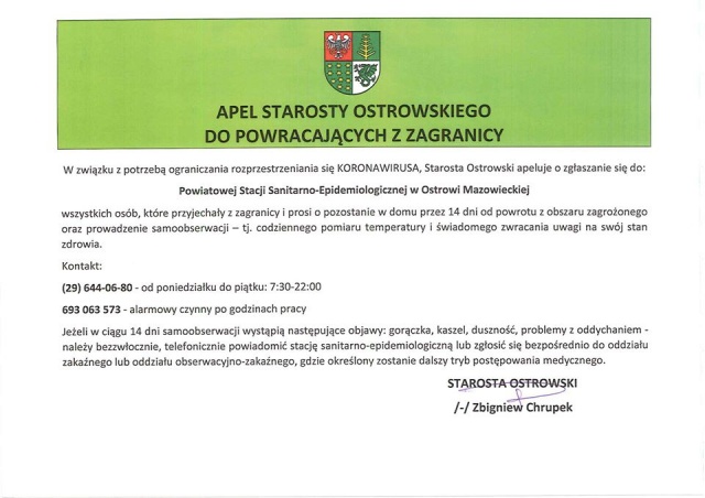 Poniżej przedstawiamy pełną treść apelu starosty Zbigniewa Chrupka.