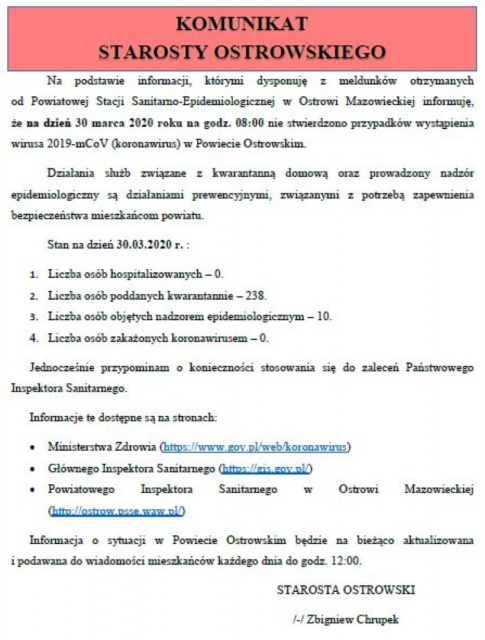 Poniżej prezentujemy pełną treść komunikatu starosty Zbigniewa Chrupka.