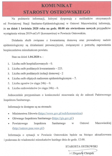 Poniżej prezentujemy pełną treść komunikatu starosty Zbigniewa Chrupka.