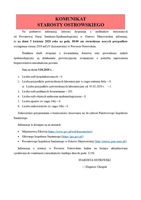Poniżej prezentujemy pełną treść komunikatu starosty Zbigniewa Chrupka.