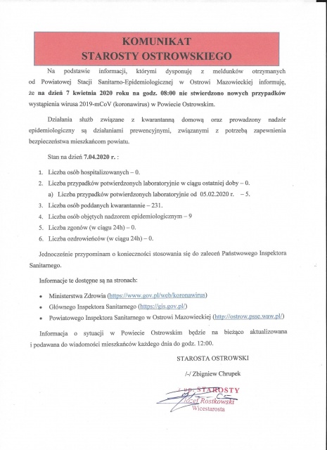 Poniżej prezentujemy pełną treść komunikatu starosty Zbigniewa Chrupka.