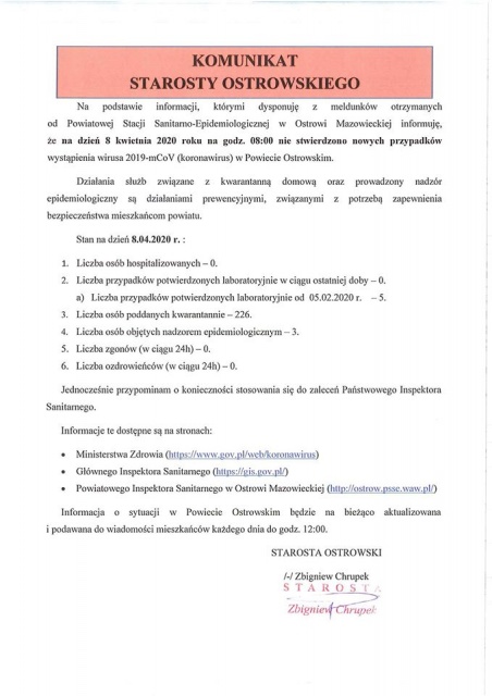 Poniżej prezentujemy pełną treść komunikatu starosty Zbigniewa Chrupka.