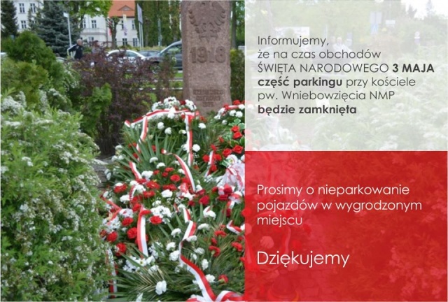 Informujemy, że na czas obchodów święta część parkingu przy kościele pw. Wniebowzięcia Najświętszej Maryi Panny będzie zamknięta.