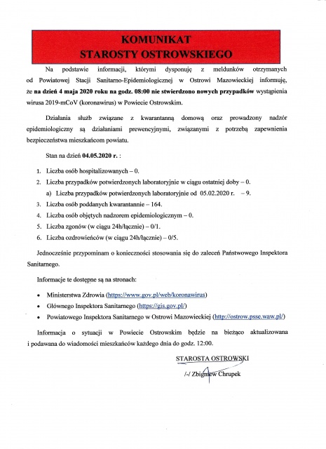 Poniżej prezentujemy pełną treść komunikatu starosty Zbigniewa Chrupka.