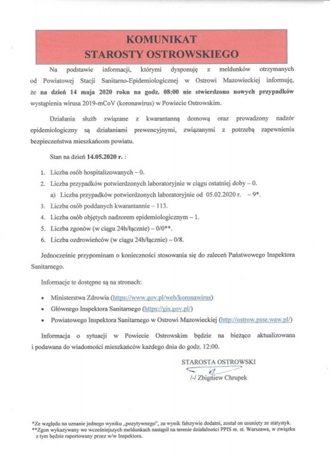 Poniżej prezentujemy pełną treść komunikatu starosty Zbigniewa Chrupka.