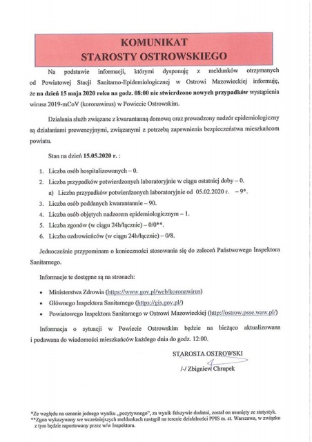 Poniżej prezentujemy pełną treść komunikatu starosty Zbigniewa Chrupka.