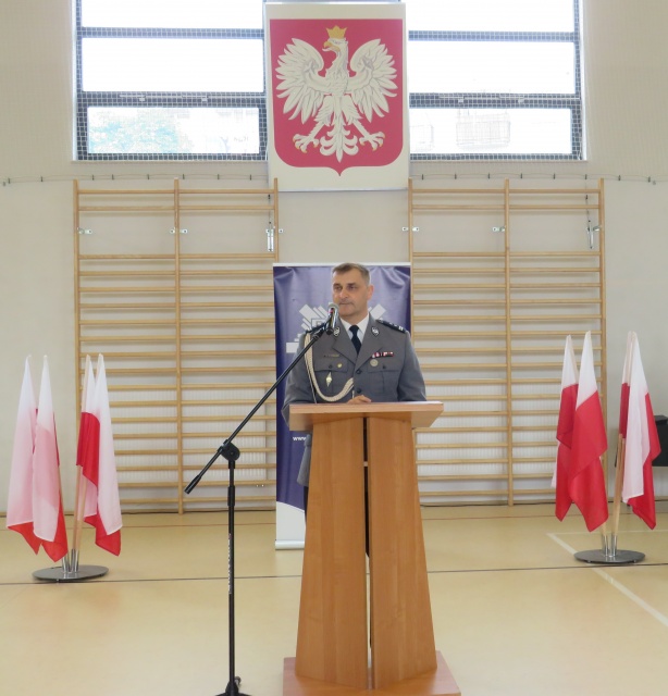 Komendant powiatowy policji podczas przemówienia podziękował policjantom za codzienną służbę. Skierował również wyrazy wdzięczności do policjantek z uwagi na fakt, że w tym roku przypada 95 rocznica służby kobiet w policji. Wyraził uznanie dla umiejętnego łączenia służby w policji z wykonywaniem rodzinnych obowiązków. Przekazał również słowa wdzięczności rodzinom funkcjonariuszy/funkcjonariuszek za zrozumienie specyfiki tego trudnego zawodu.
