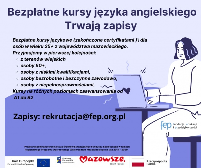 Jeśli chodzi o bezpłatne kursy językowe (zakończone certyfikatami) dla osób w wieku 25 + (z województwa mazowieckiego), to w pierwszej kolejności przyjmowane są: osoby z terenów wiejskich, osoby 50 +, osoby z niskimi kwalifikacjami, osoby bezrobotne i bezczynne zawodowo i osoby z niepełnosprawnościami.