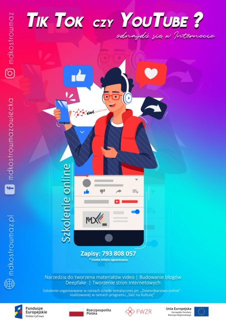 MDK w Ostrowi Mazowieckiej zaprasza osoby w wieku 10-14 lat do udziału w bezpłatnym szkoleniu online zatytułowanym TikTok czy YouTube? Odnajdź się w Internecie organizowanym w ramach ścieżki Dziennikarstwo online realizowanej z projektu Sieć na kulturę.