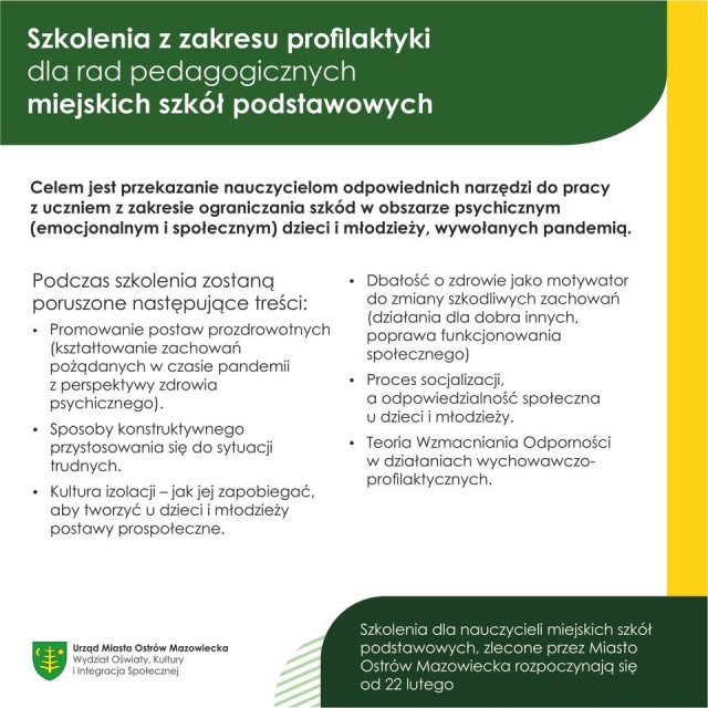 Podczas szkoleń zostaną poruszone następujące treści: promowanie postaw prozdrowotnych (kształtowanie zachowań pożądanych w czasie pandemii z perspektywy zdrowia psychicznego), sposoby konstruktywnego przystosowania się do sytuacji trudnych, kultura izolacji - jak jej zapobiegać, aby tworzyć u dzieci i młodzieży postawy prospołeczne, dbałość o zdrowie jako motywator do zmiany szkodliwych zachowań (działania dla dobra innych, poprawa funkcjonowania społecznego), proces socjalizacji a odpowiedzialność społeczna u dzieci i młodzieży oraz teoria wzmacniania odporności w działaniach wychowawczo-profilaktycznych.
