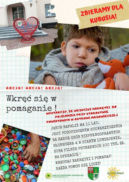 Ostatnio Kubusia Rafalika, dla którego obecnie są zbierane zakrętki, wsparli uczniowie oraz nauczyciele z Liceum Ogólnokształcącego im. M. Kopernika w Ostrowi Mazowieckiej. Link do zbiórki na rzecz Kubusia: https://zrzutka.pl/5vgxzs. Link do licytacji: https://www.facebook.com/groups/627991981203246.