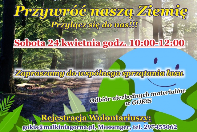 Do przyłączenia się do akcji zaproszeni są wszyscy chętni wolontariusze. Sprzątanie odbędzie się 24 kwietnia. Rejestrować można się za pośrednictwem podanego na plakacie numeru telefonu, adresu poczty elektronicznej, a także poprzez fanpage'a GOKiS-u. Więcej informacji: https://www.facebook.com/GOKiS-Ma%C5%82kinia-G%C3%B3rna-260688364052982/.