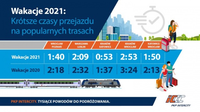 W porównaniu z wakacjami w roku 2020, według zapewnień PKP, skrócą się czasy przejazdu na popularnych trasach. "Najszybszy pociąg dalekobieżny na trasie Wrocław - Poznań pojedzie w czasie 1 h 40 min, przed rokiem to 2 h 18 min. Podróż na trasie Warszawa - Lublin, w porównaniu z rokiem poprzednim, skróci się o 23 min" - czytamy w komunikacie PKP Intercity. Wakacyjna korekta rozkładu jazdy będzie obowiązywała do 28 sierpnia.
