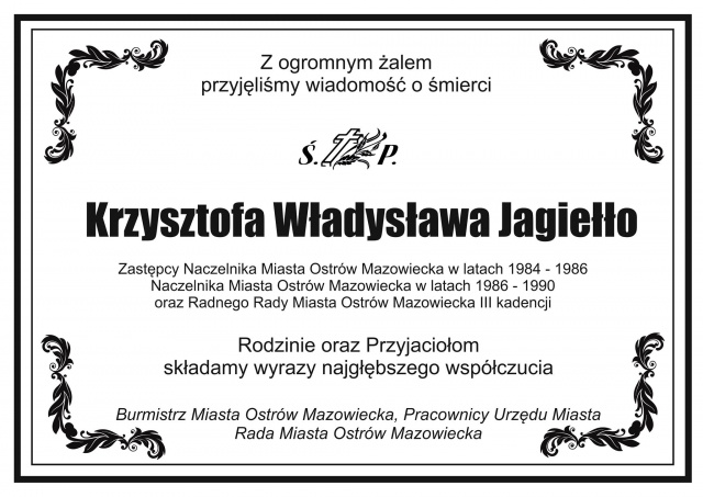 Rodzinie oraz przyjaciołom zmarłego burmistrz Ostrowi Mazowieckiej, Rada Miasta Ostrów Mazowiecka oraz pracownicy urzędu składają wyrazy najgłębszego współczucia.