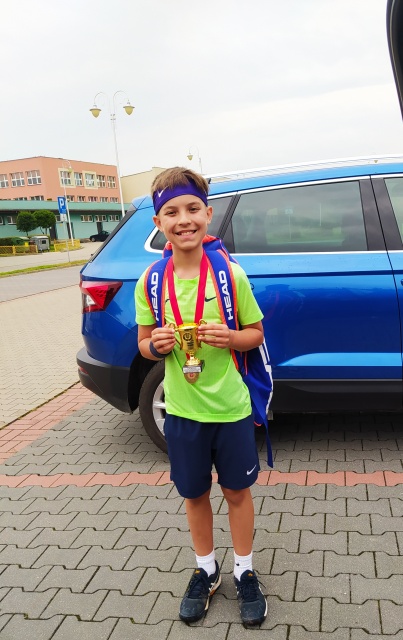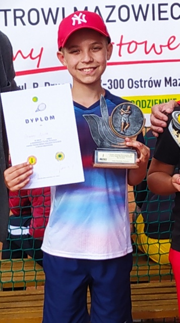 Młody zawodnik zdobył złoto także w kat. do lat 12 w Ostrołęce (zawody odbyły się 5.09.2021 r. na kortach MZOS-TilT w Ostrołęce w ramach Mistrzostw Powiatowych). Nad wydarzeniem patronat objął Stanisław Kubeł, starosta ostrołęcki.