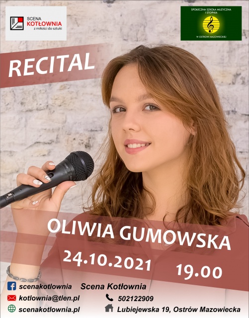 Społeczna Szkoła Muzyczna I stopnia w Ostrowi Mazowieckiej zaprasza na recital Oliwii Gumowskiej - 24 października o godz. 19.00 w ostrowskim teatrze (Scena Kotłownia przy ul. Lubiejewskiej 19). Będzie to kolejne spotkanie z cyklu Rozśpiewana Ostrów wznowionego po przerwie pandemicznej.