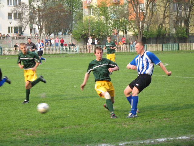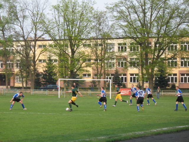 Po bardzo szybkim początku spotkania w 7 minucie nasz zespół objął prowadzenie. Z lewej strony mocno dośrodkował Paweł Krzak, a głową piłkę w "okienko' skierował Piotrek Niwiński. Potem przewagę zdobyli goście. Groźnie pod naszą brankę było po rzucie rożnym i dwóch rzutach wolnych, egzekwowanych z okolic pola karnego. W 37 minucie nasz zespół zdobył drugiego gola. Po rzucie rożnym piłkę na jedenastym metrze otrzymał Aleksander Bazei i płaskim strzałem w długi róg pokonał golkipera gości.