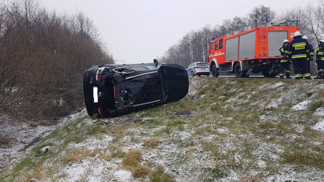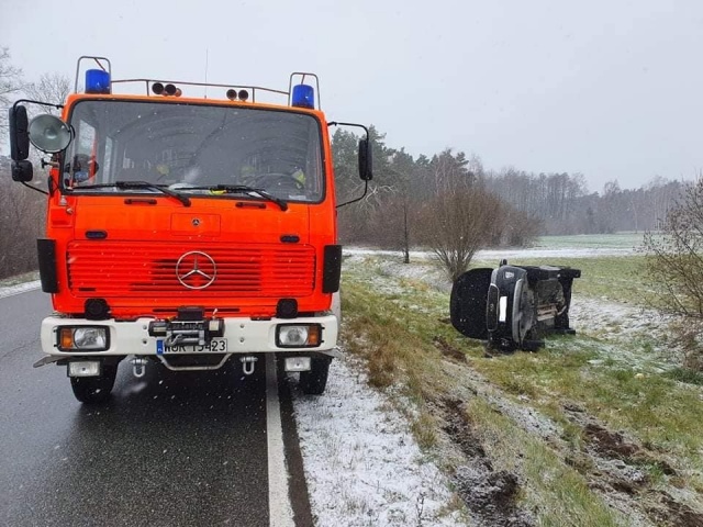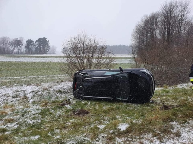 Osoba kierująca samochodem osobowym, jadąca w kierunku Ostrowi Mazowieckiej, zjechała z pasa ruchu. Auto wpadło do przydrożnego rowu.