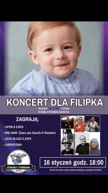 16.01.2022 godz. 18.00 odbędzie się Koncert dla Filipka. Krówka i Połówka na żywo + online. To kolejna okazja, by pomóc małemu wojownikowi: https://www.facebook.com/events/595250234876842/.