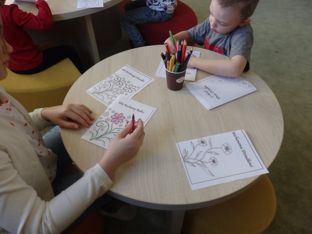 Dzieci w dowolny sposób udekorowały swoje laurki przygotowanymi wcześniej kolorowymi materiałami, a piękne prace zabrały do domu.
