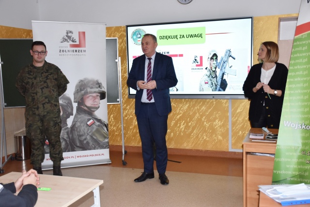 Zaprezentowali im bardzo interesującą dla młodych ludzi ofertę Wojska Polskiego, w szczególności zasady rekrutacji do wyższych szkół wojskowych, szkół podoficerskich oraz WOT-u. Przedstawili także informację dotyczącą uposażenia wojskowych oraz różnych przywilejów dla kadetów i czynnych żołnierzy.