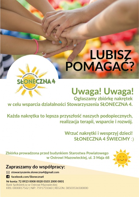 Jedną z form pomocy jest przekazywanie zakrętek. Specjalny pojemnik w kształcie serca z przeznaczeniem właśnie na ten cel jest ustawiony przy Starostwie Powiatowym w Ostrowi Mazowieckiej.