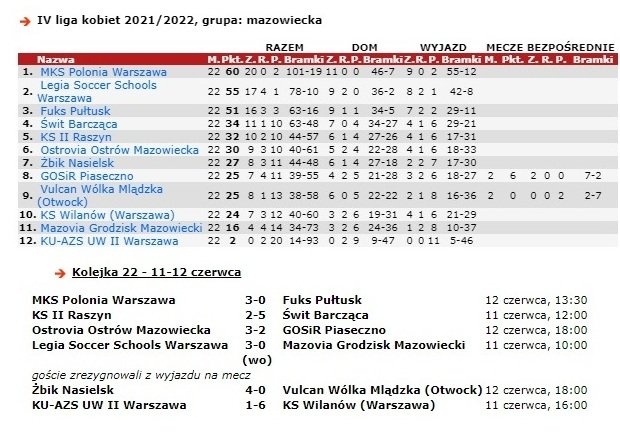Mecz z drużyną GOSiR Piaseczno odbył się 12 czerwca na stadionie przy ul. Warchalskiego w Ostrowi Mazowieckiej. Był to ostatni mecz sezonu 2021/2022. Dzięki zwycięstwu nad drużyną gości ostrowska drużyna kobiet uplasowała się na zakończenie sezonu na 6. miejscu w grupie mazowieckiej IV ligi kobiet.