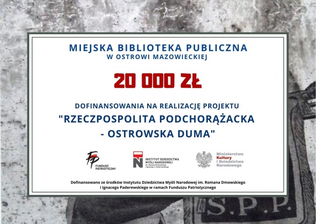Miejska Biblioteka Publiczna w Ostrowi Mazowieckiej otrzymała dofinansowanie w kwocie 20 tys. zł na realizację projektu "Rzeczpospolita Podchorążacka - ostrowska duma". W ramach projektu zorganizowany zostanie m.in. piknik historyczny zakończony wspólnym śpiewaniem, warsztaty rękodzielnicze oraz autokarowy rajd historyczny.