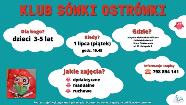 Klub Sówki Ostrówki to warsztaty literacko-plastyczno-ruchowe dla dzieci w wieku 3-5 lat. Podstawą każdych zajęć jest książka w połączeniu z zabawami plastycznymi lub ruchowymi.