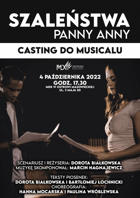 4 października o godz. 17:30 w MDK Ostrów Mazowiecka przy ul. 3 Maja 50 odbędzie się casting do musicalu "Szaleństwa Panny Anny".
