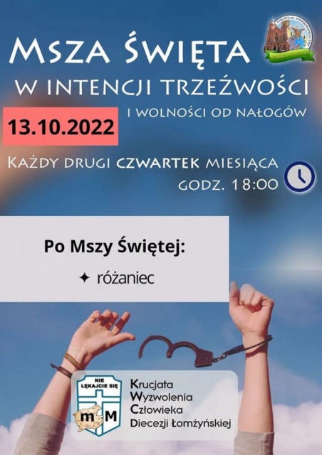 Parafia Wniebowzięcia NMP w Ostrowi Mazowieckiej zaprasza na mszę świętą w intencji trzeźwości i wolności od nałogów w najbliższy czwartek 13 października o godz. 18.00. Po Mszy św. wspólny różaniec prowadzony przez członków Krucjaty Wyzwolenia Człowieka.