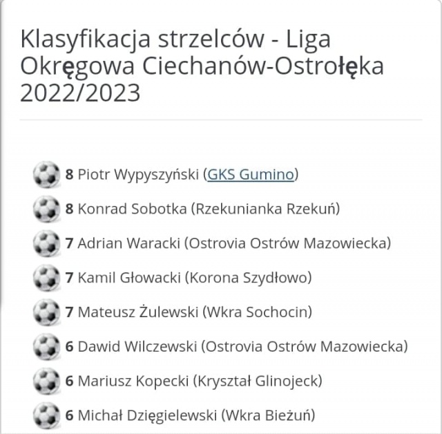 Po dziewięciu meczach Ligi Okręgowej Ciechanów-Ostrołęka przygotowana została klasyfikacja najlepszych strzelców, wśród których znaleźli się piłkarze ostrowskiej drużyny.