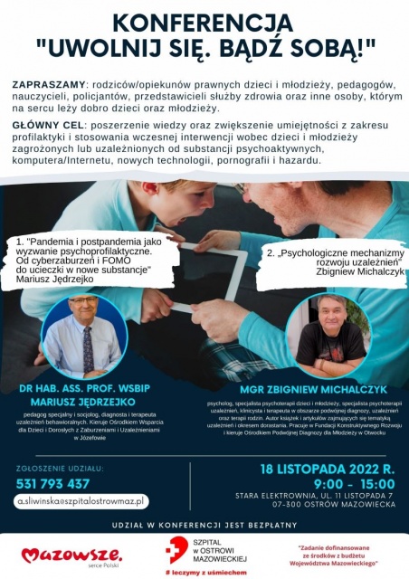 Szpital w Ostrowi Mazowieckiej wraz z Poradnią Terapii Uzależnienia od Alkoholu i Współuzależnienia zapraszają do udziału w bezpłatnej konferencji: rodziców/opiekunów prawnych dzieci i młodzieży, pedagogów, nauczycieli, policjantów, przedstawicieli służby zdrowia oraz inne osoby, którym na sercu leży dobro dzieci oraz młodzieży z terenu Miasta i Gminy Ostrów Mazowiecka oraz Gminy Sadowne.