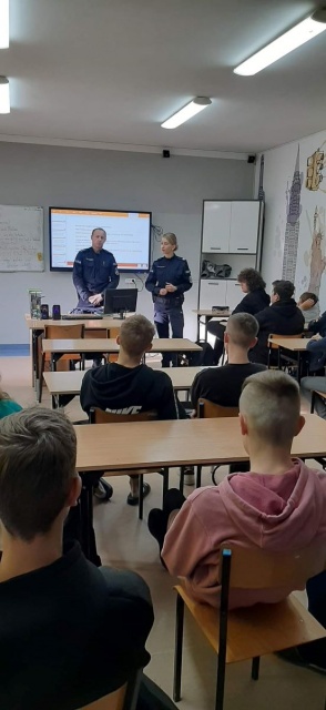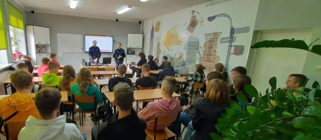 Ostrowscy policjanci z zespołu ds. profilaktyki społecznej, nieletnich i patologii odwiedzają kolejne szkoły średnie aby rozmawiać z młodzieżą.