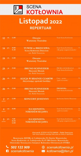 Listopad i początek grudnia to dla Teatru Scena Kotłownia pracowity okres. Grupa teatralna przygotowuje się intensywnie do premiery sztuki Stanisława Mrożka pt. "Bruno Schneider". Chętni mogą cały czas dołączyć do grupy teatralnej Scena Kotłownia i wziąć udział w warsztatach teatralnych.