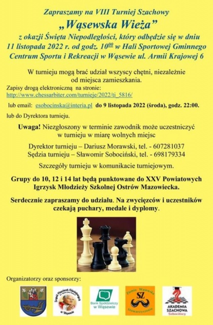 VIII Turniej Szachowy "Wąsewska Wieża" odbędzie się z okazji Święta Niepodległości w dniu 11 listopada 2022 roku o godzinie 10 w Hali Sportowej Gminnego Centrum Sportu i Rekreacji w Wąsewie.