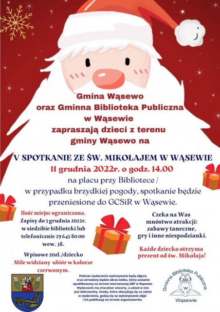 Gminna Biblioteka Publiczna zaprasza wszystkie dzieci wraz z rodzicami na "V Spotkanie ze Św. Mikołajem w Wąsewie". Start 11 grudnia 2022 r. o godz. 14:00